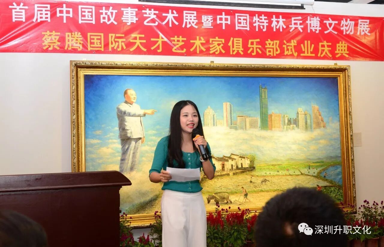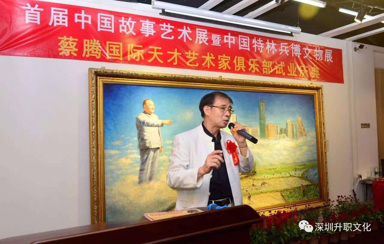 10月12日,广东深圳,首届中国故事艺术展暨中国特林兵博文物展、 蔡腾国际天才艺术家俱乐部试业庆典在大芬油画村卢浮宫三楼隆重开幕。联合国文化发展委员会王宇主席,湖南省军区原副司令员蒋家作将军,广州军区审计局原局长赵雪勤大校,深圳新四军研究会会长、中国特林兵博物馆荣誉馆长胡炜馆长,世界和平大学张成振校长,潮汕联合控股有限公司罗芳董事长,香港国际美术家协会陈杰叠森副主席,海外叶剑英研究会陈勇耀副会长,深圳世王会王伟执行会长,南岭村书画协会曾嘉克名誉会长,香港美术教育协会委员、世界华人美术教育协会曾钜桓副主席,联合国文化发展委员会、油画创作委员会执行秘书长蔡红英秘书长,世界大同基金会秘书长、香港华商国际文化产业集团主席姚金忠先生,天才艺术家俱乐部创始人、深圳市乐茶网实业发展有限公司詹木存先生,香港飞扬国际书画艺术品有限公司杨清梅女士和香港国际美术家协会会长、中国油画产业第一人、大中华文化科技主题公园创始人蔡腾先生等共同参加开幕式。